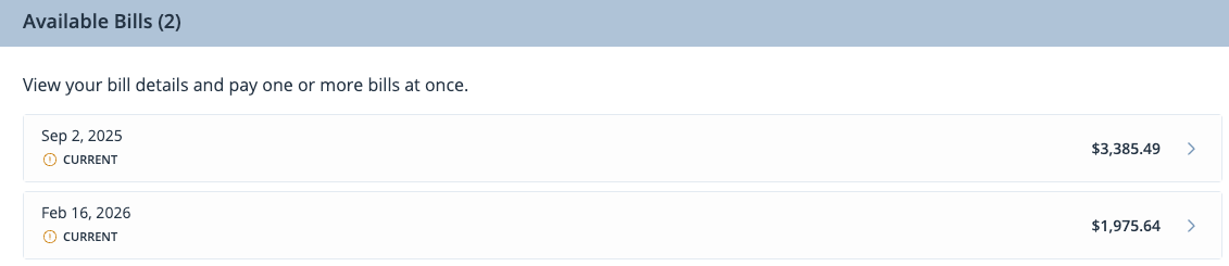 5. Available bills will appear. You may click on the arrow next to the amount to view additional bill information.