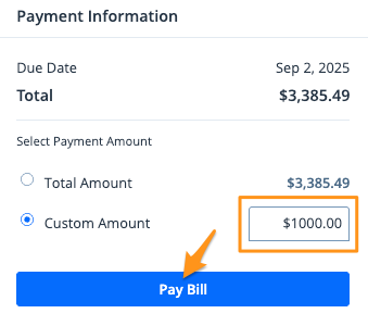 2. Enter your partial payment amount in the “Custom Amount” field and click Pay Bill