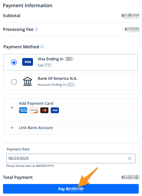 4. Select a payment method, choose a “Payment Date,” then click the blue Pay $--.-- button to complete your payment