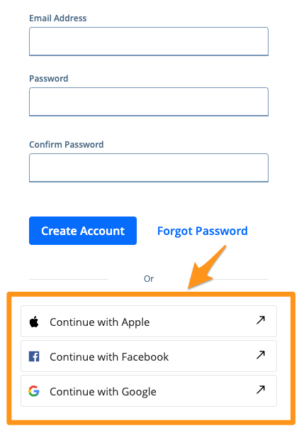 - To create an account using a social option, click Continue with Apple, Continue with Facebook or Continue with Google. Please note, availability of these social options can vary.